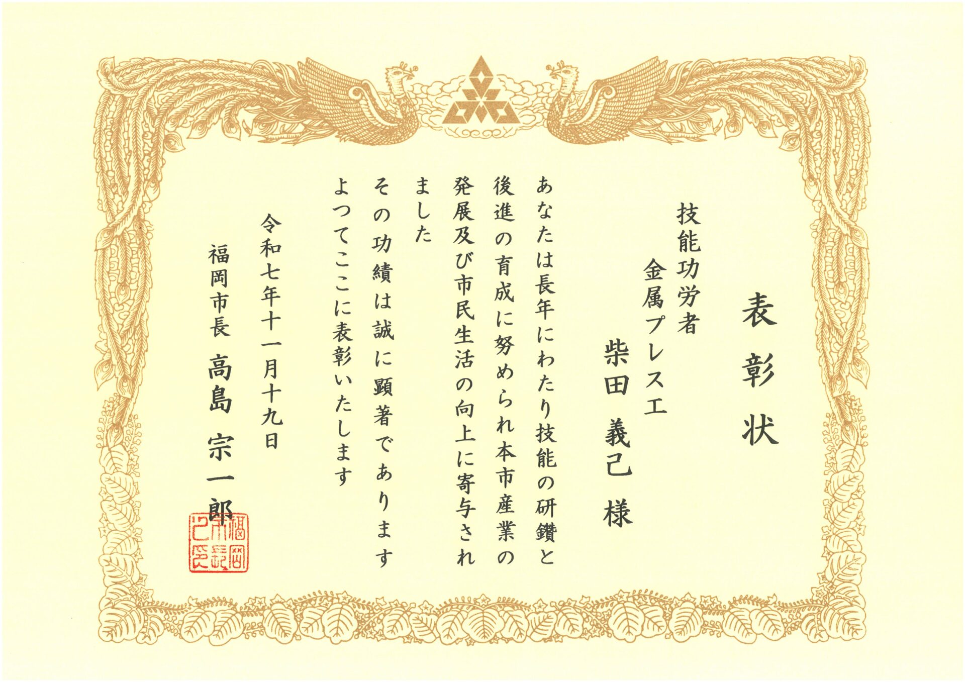 2025年11月19日(水)、弊社社員が福岡市より技能功労者として表彰されました。