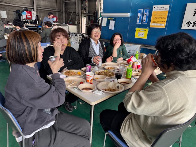 焼きあがった肉・焼きそば・海鮮をがっつく社員たち(汗)