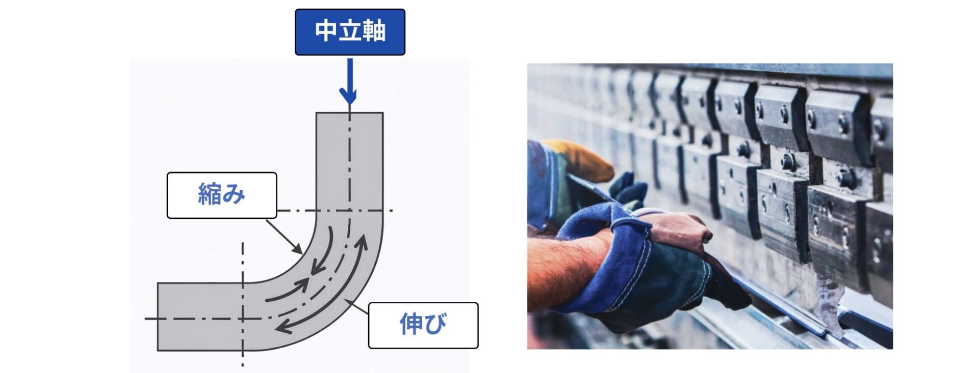 板金を曲げるとき、板厚の中心付近には中立軸と呼ばれる変形のない層が生じます。中立軸は、外側の引張と内側の圧縮がちょうど打ち消し合う位置にあり、そこを境に応力の向きが変わります。中立軸そのものは長さが変わらないため、展開寸法の基準として用いられます。