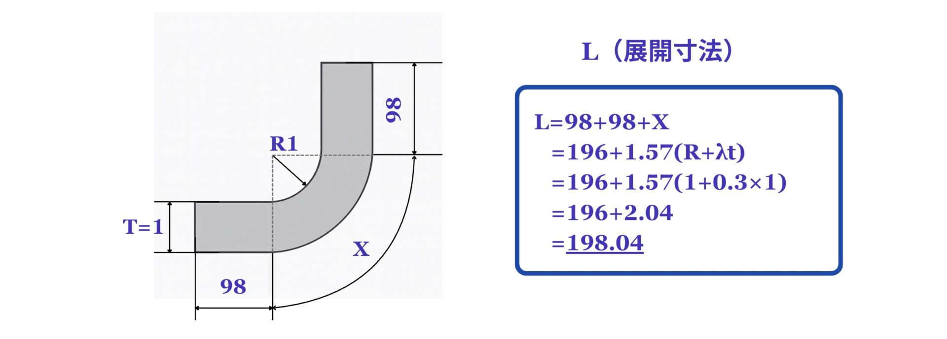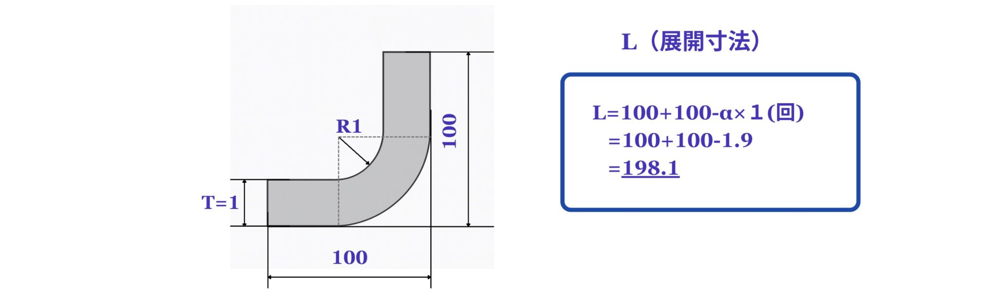 例えば、縦横100mm、板厚1mm、曲げR1のL形製品の展開寸法は以下のようになります。(材料はSPCCの場合)