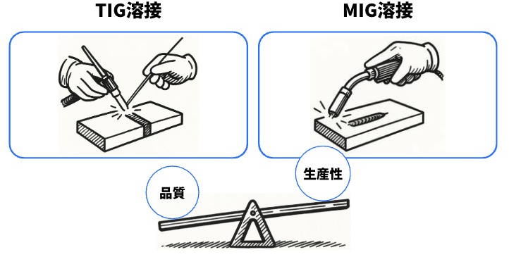 一方で、溶接速度が遅いため、生産性は高くありません。作業者の技術力に左右されやすく、手動での溶接には高度なスキルが必要です。TIG溶接は、品質重視・見た目重視の用途に向いた方法であり、設計段階での用途の見極めがポイントとなります。