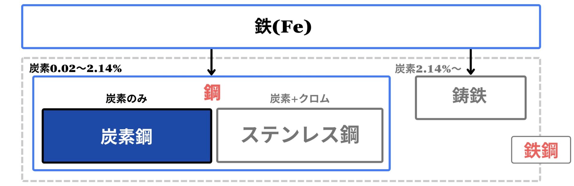 原材料となる鉄(Fe)に少量の炭素を加えたものを炭素鋼と呼び、多量の炭素を加えたものを鋳鉄と呼びます。さらに、炭素鋼は炭素の含有量と製造方法の2つの観点で分類されます。