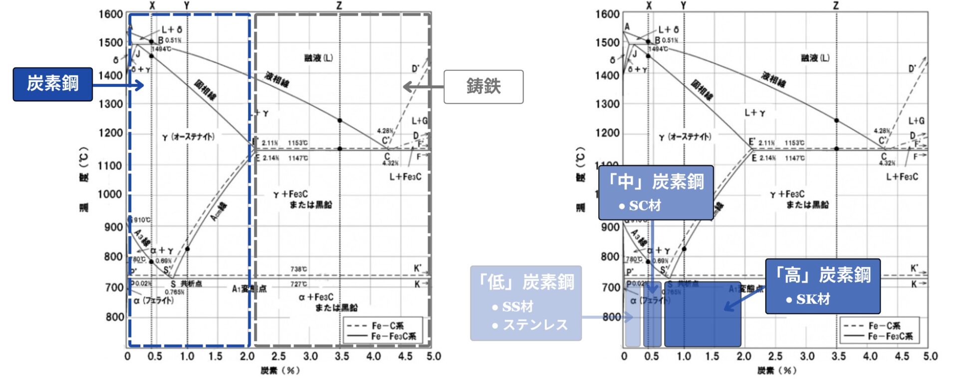 (※SS材の中でも含まれる炭素量によってグレードが幅広くあり、中には中炭素鋼に分類されるものもあります。)